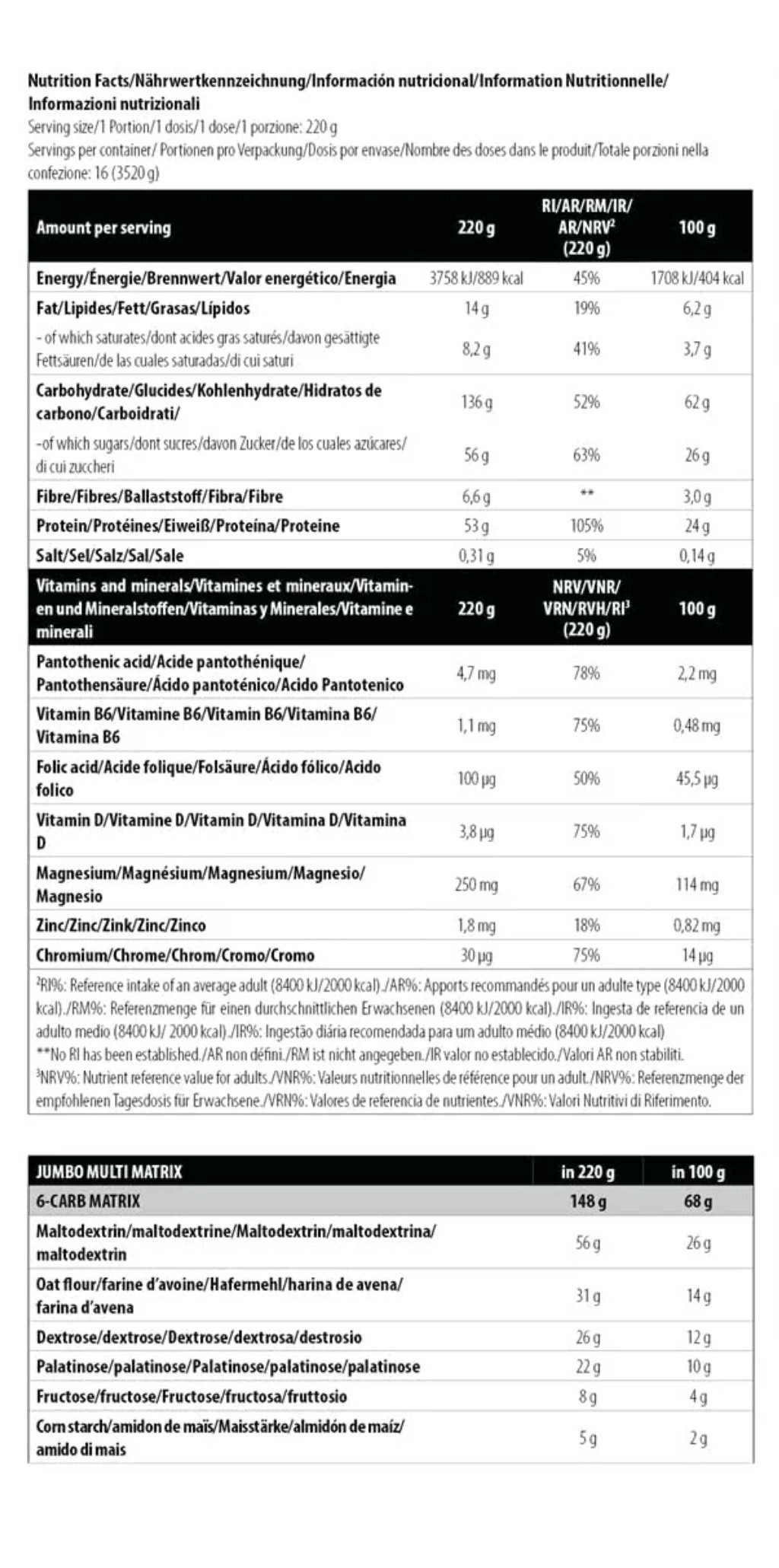 بروتين Jumbo هو مكمل غذائي من إنتاج شركة Scitec Nutrition، وهو مصمم لزيادة الوزن وبناء العضلات. يحتوي على مزيج منالبروتين والكربوهيدرات والكرياتين والعديد من المكونات الأخرى التي تساعد على دعم نمو العضلات وتعزيز الأداء الرياضي.